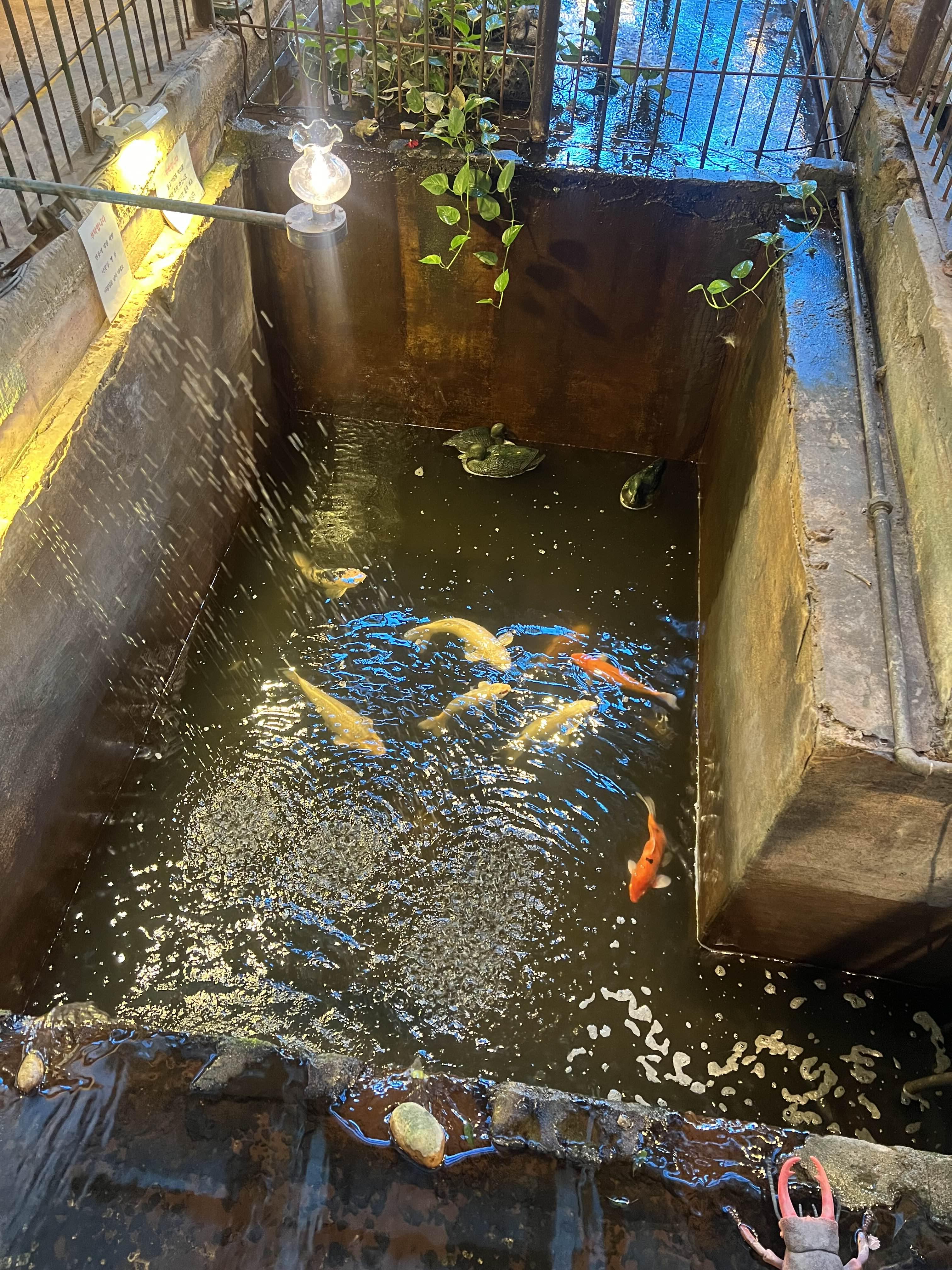 카페 안에 이런 우물?!같은게 있어서 여기에 물고기가 헤엄치는 광경