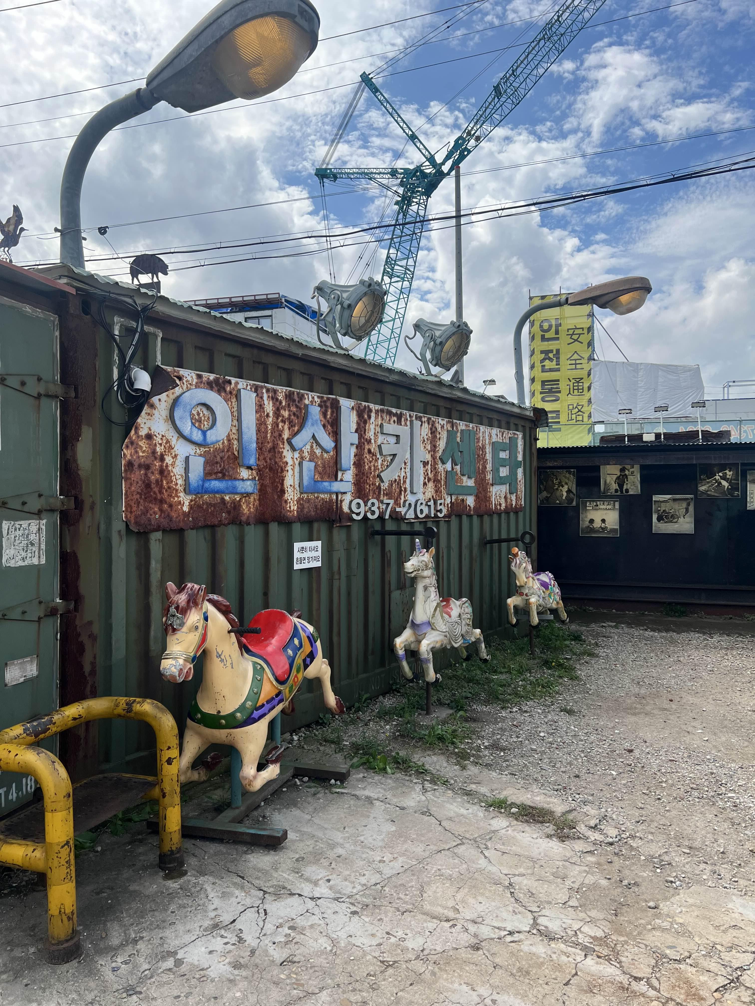 낡은 버스도 보이고, 망한 놀이공원의 회전목마의 일부분으로 있을 것 같은 말 모형,